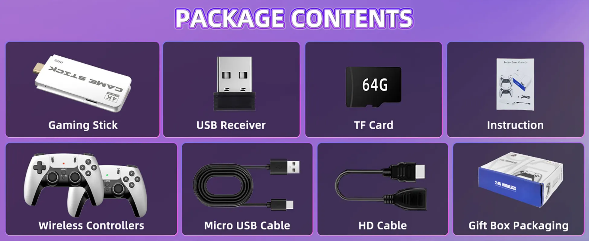 Relive the golden era of gaming with the GamingBoy Retro Game Console Stick. Preloaded with 20,000+ classic titles and 23 emulators, this compact console delivers hours of nostalgic fun without any downloads or internet needed. Just plug it in and play on your big screen with 4K HDMI output and dual 2.4GHz wireless controllers!