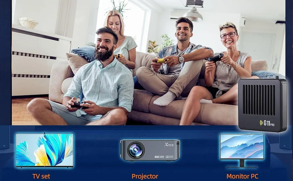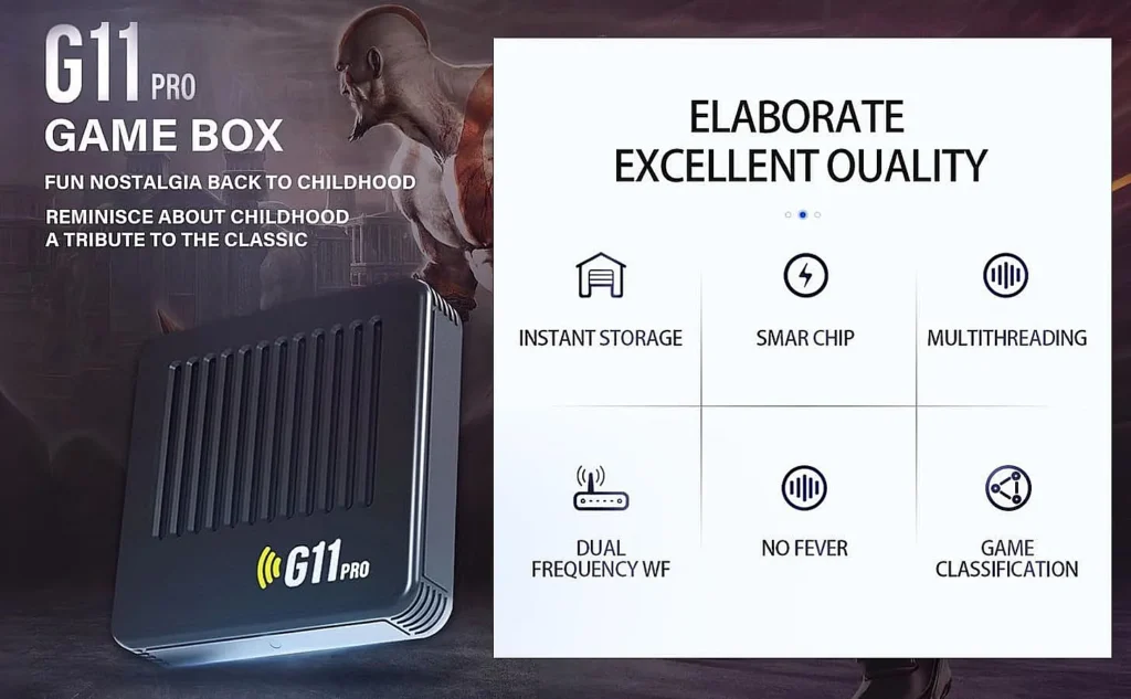 The G11 Pro Game Box is a high-performance retro gaming console that comes with over 60,000 classic games. It features an S905x2 chip and supports 4K HD output. The console includes two 2.4G wireless controllers for lag-free multiplayer gaming. With its plug-and-play design, it easily connects to any TV, making it the perfect choice for home entertainment, parties, and retro gaming enthusiasts. The package includes the console, wireless controllers, a remote, a power adapter, a USB charging cable, and an HDMI extension cable—everything you need for endless gaming fun.